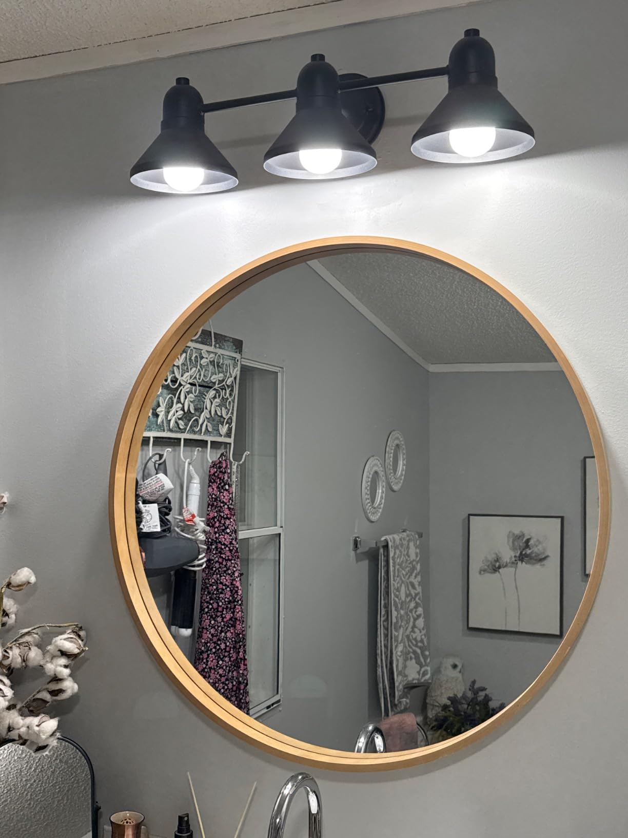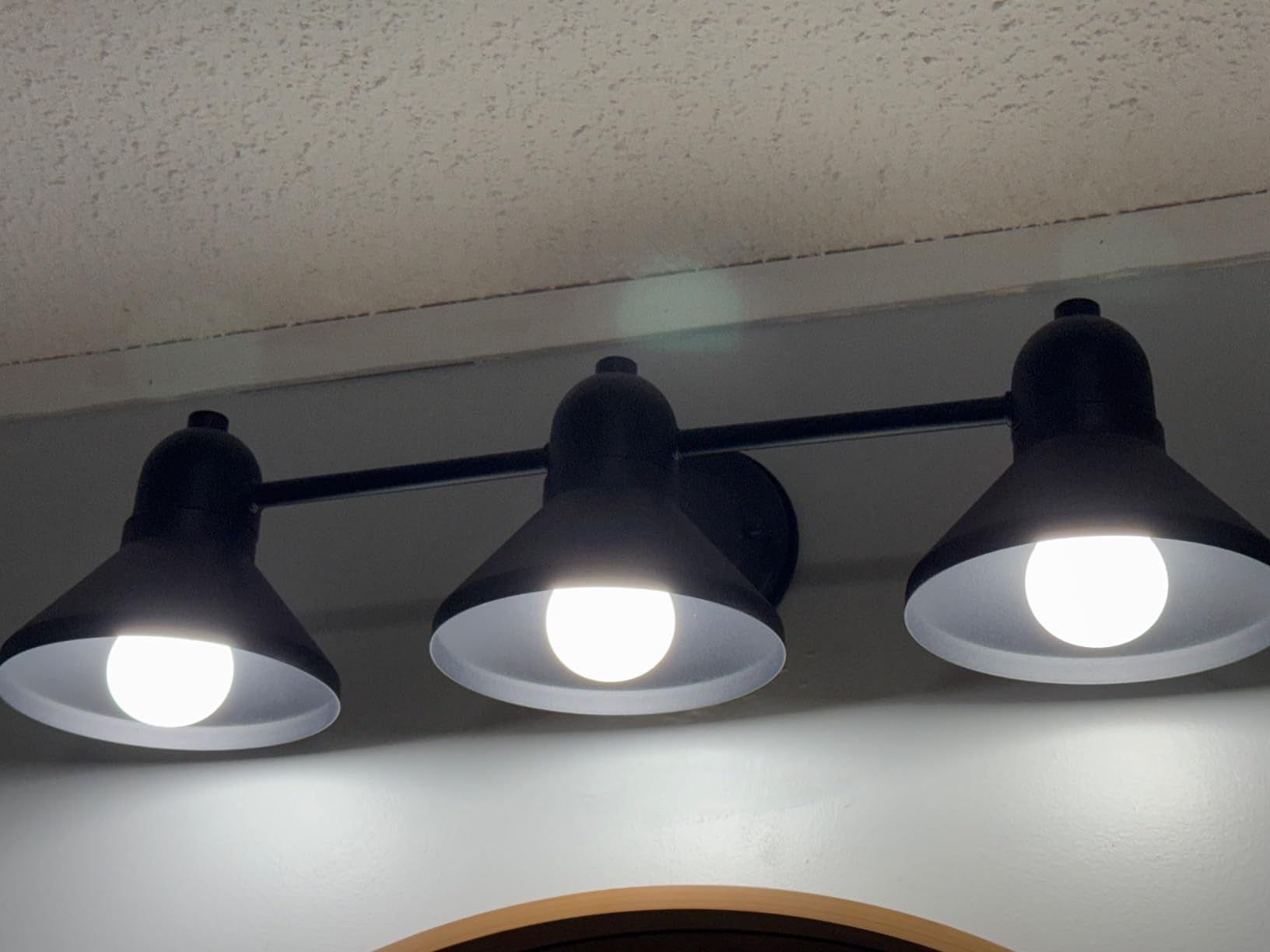 I have a normal boring suburban bathroom with an old oval medicine cabinet. I wanted to make it rustic farmhouse. I’m working in phases so the great thing about this light is that it fits well with any style. It was super easy to install with clear directions. It took me about 30 minutes to install from start to finish but that’s because I tried to reuse the wall plate from the existing light. Even though the plate and screws looked identical, they were not. There was a slight unnoticeable difference in the thickness of the wall plate. So when I went to mount the actual fixture, the screws weren’t long enough. If I’d have followed the directions and removed the old wall plate and used the one provided, I’d have saved myself time and frustration. Other than that, this was super easy to install, ands looks great. This fixture can point up or hang down so the center light didn’t interfere with my existing medicine cabinet.
